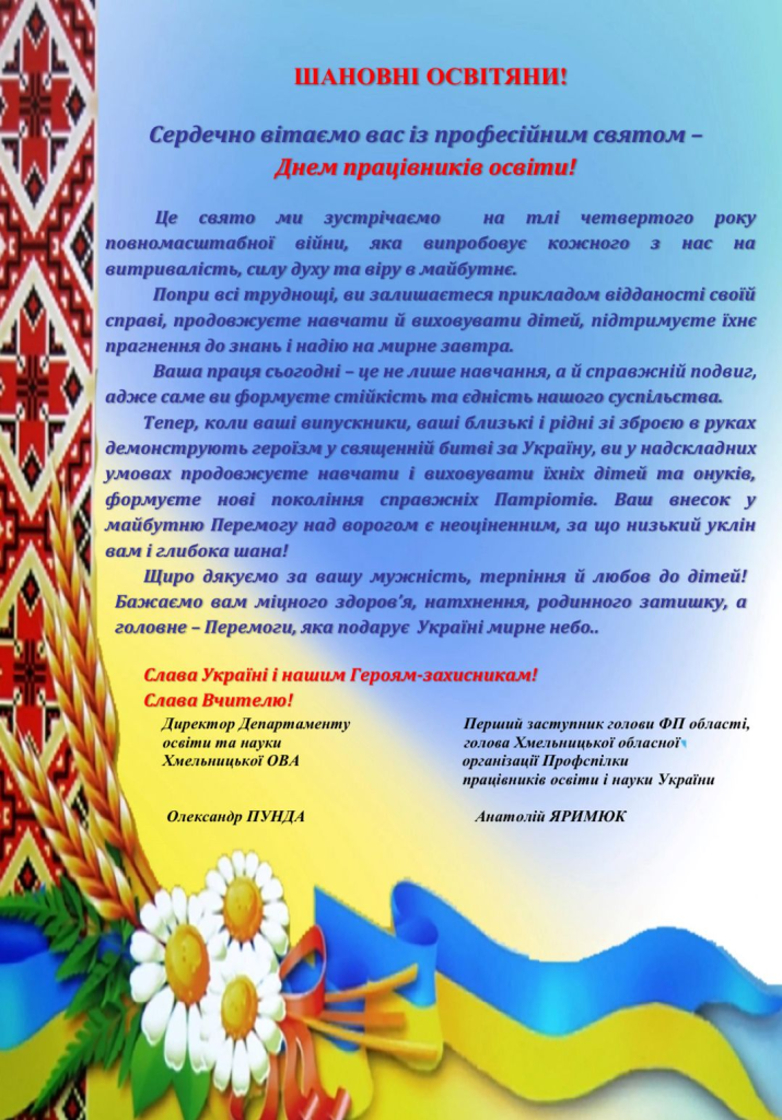 Вітаємо з Днем працівників освіти! Щиро дякуємо за вашу мужність, терпіння й любов до дітей! Бажаємо вам міцного здоров’я, натхнення, родинного затишку, а головне – Перемоги, яка подарує Україні мирне небо.