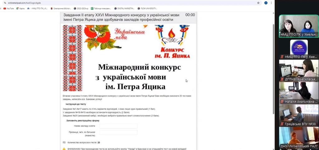 Конкурсне завдання учасників складалося із двох етапів. Спочатку здобувачі закладів професійної освіти області виконували тестові завдання з використанням онлайн-конструктора Test Pad, після того здійснювали написання вільного есе з теми: «Немає багатства над тілесне здоров’я і немає щастя над сердечну радість».