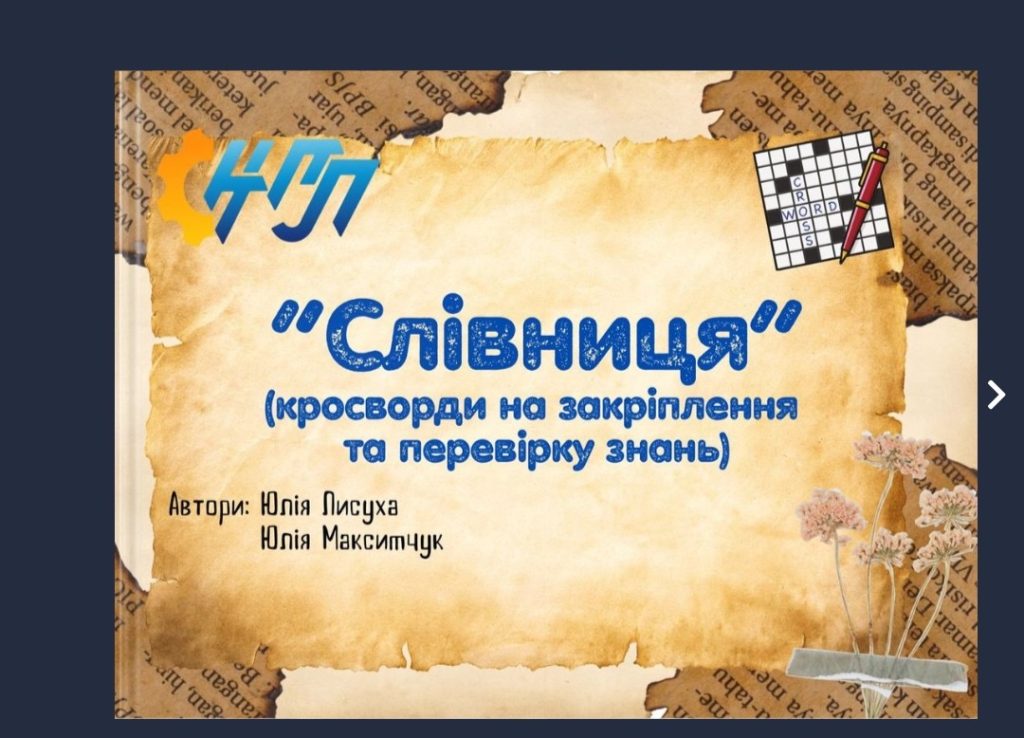 🔹Лисуха Юлія Андріївна, Юлія Максимчук, викладачки Нетішинського професійного ліцею, – електронний посібник “Слівниця” (кросворди на закріплення та перевірку знань) (диплом ІІІ ступеня);