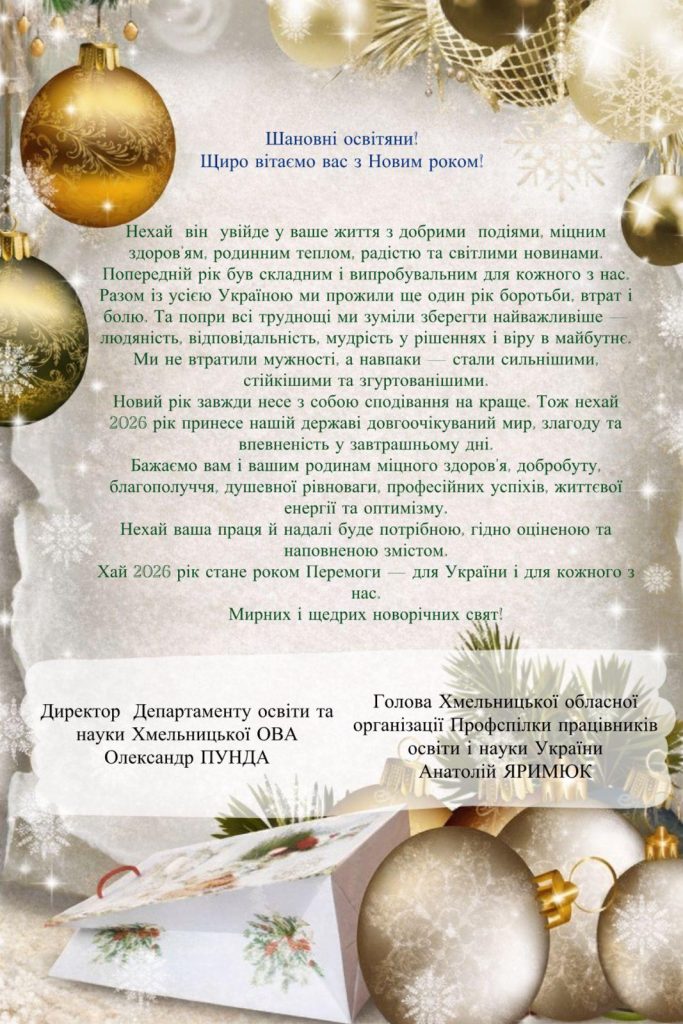 Новий рік завжди несе з собою сподівання на краще. Тож нехай 2026 рік принесе нашій державі довгоочікуваний мир, злагоду та впевненість у завтрашньому дні. Бажаємо вам і вашим родинам міцного здоров’я, добробуту, благополуччя, душевної рівноваги, професійних успіхів, життєвої енергії та оптимізму. Нехай ваша праця й надалі буде потрібною, гідно оціненою та наповненою змістом. Хай 2026 рік стане роком Перемоги — для України і для кожного з нас. Мирних і щедрих новорічних свят!