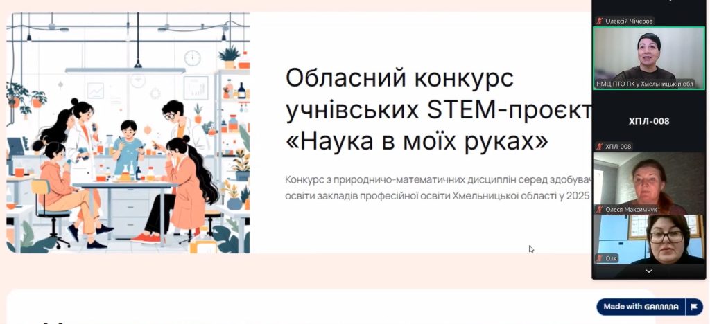 У рамках обласного Конкурсу учнівських STEM-проєктів «Наука в моїх руках», що проводиться Науково-методичним центром професійно-технічної освіти та підвищення кваліфікації інженерно-педагогічних працівників у Хмельницькій області, 2 грудня відбувся онлайн-захист 24 учнівських робіт, представлених здобувачами освіти закладів професійної освіти області.